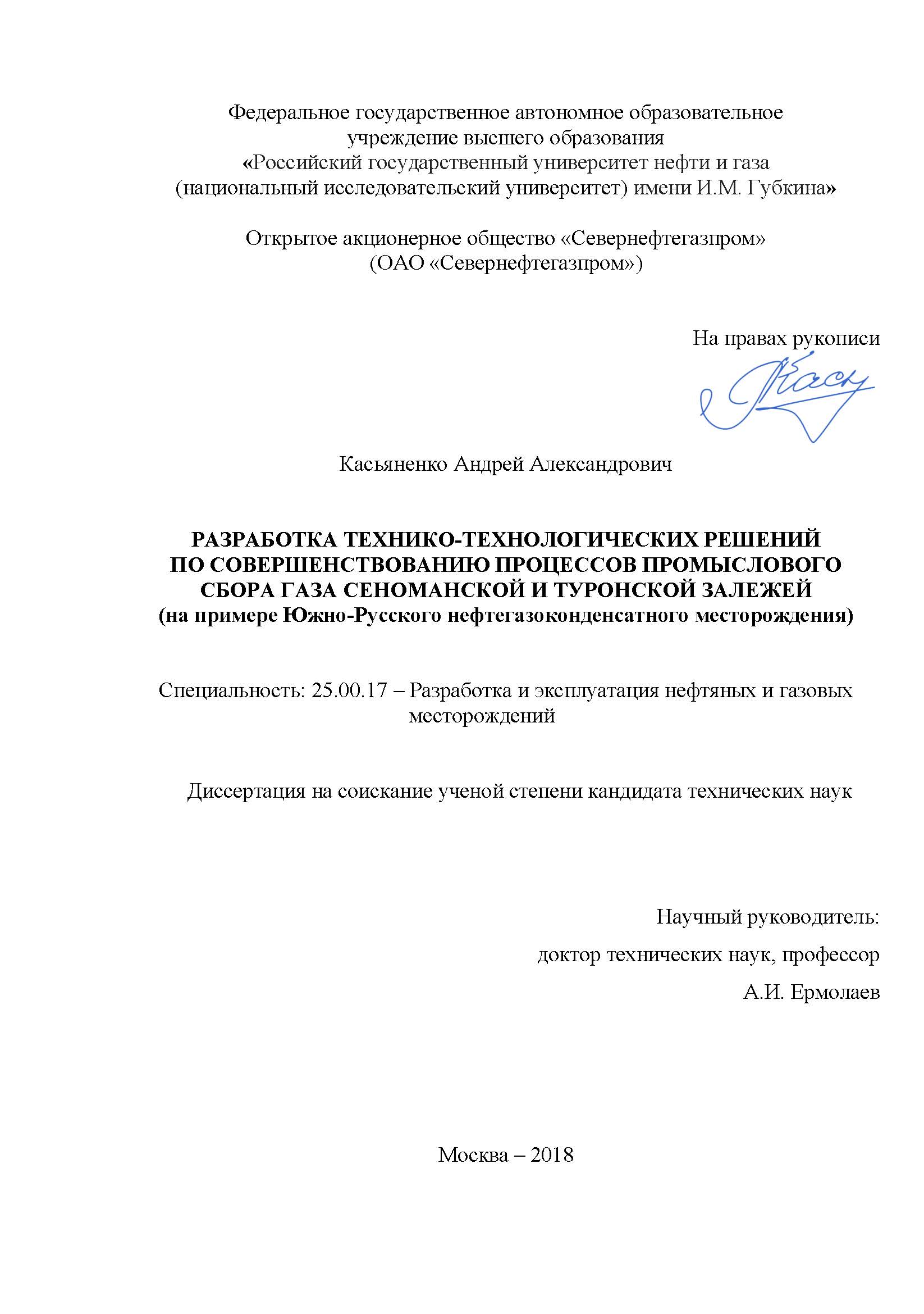 Разработка технико-технологических решений по совершенствованию процессов промыслового сбора газа Сеноманской и Турунской залежей (на примере Южно-Русского нефтегазоконденсатного месторождения)