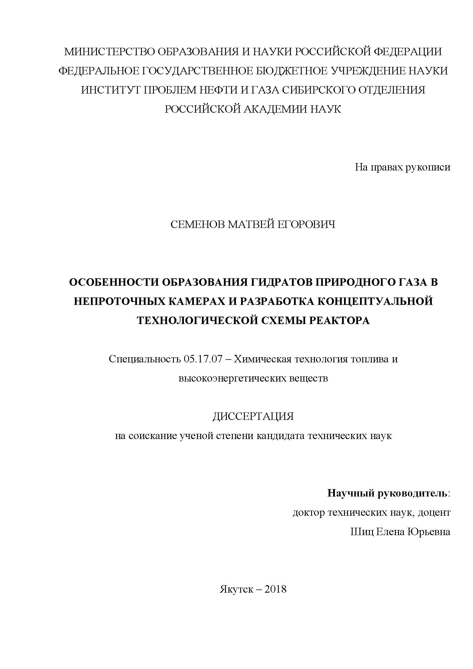 Особенности образования гидратов природного газа в непроточных камерах и разработка концептуальной технологической схемы реактора