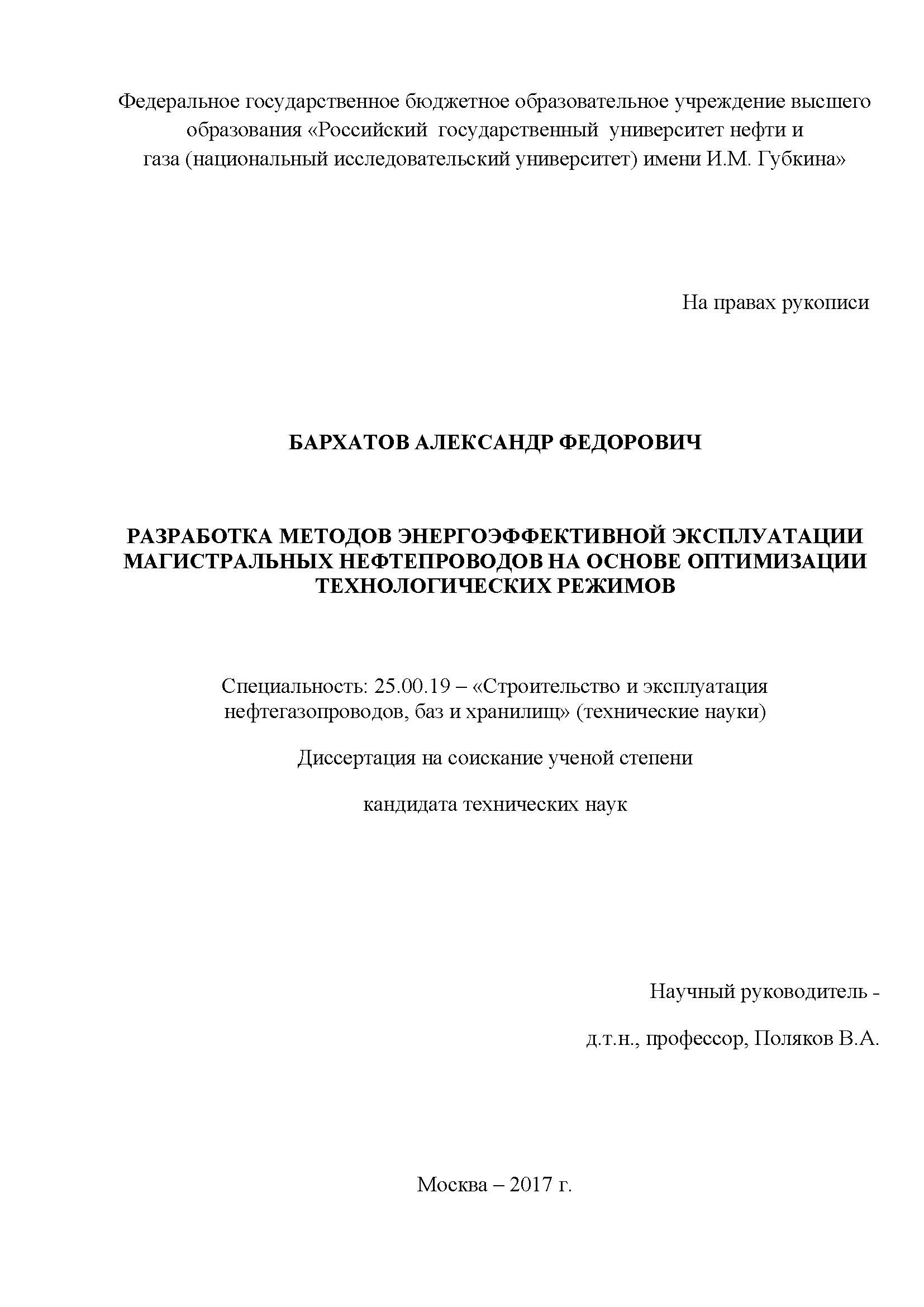Разработка методов энергоэффективной эксплуатации магистральных нефтепроводов на основе оптимизации технологических режимов