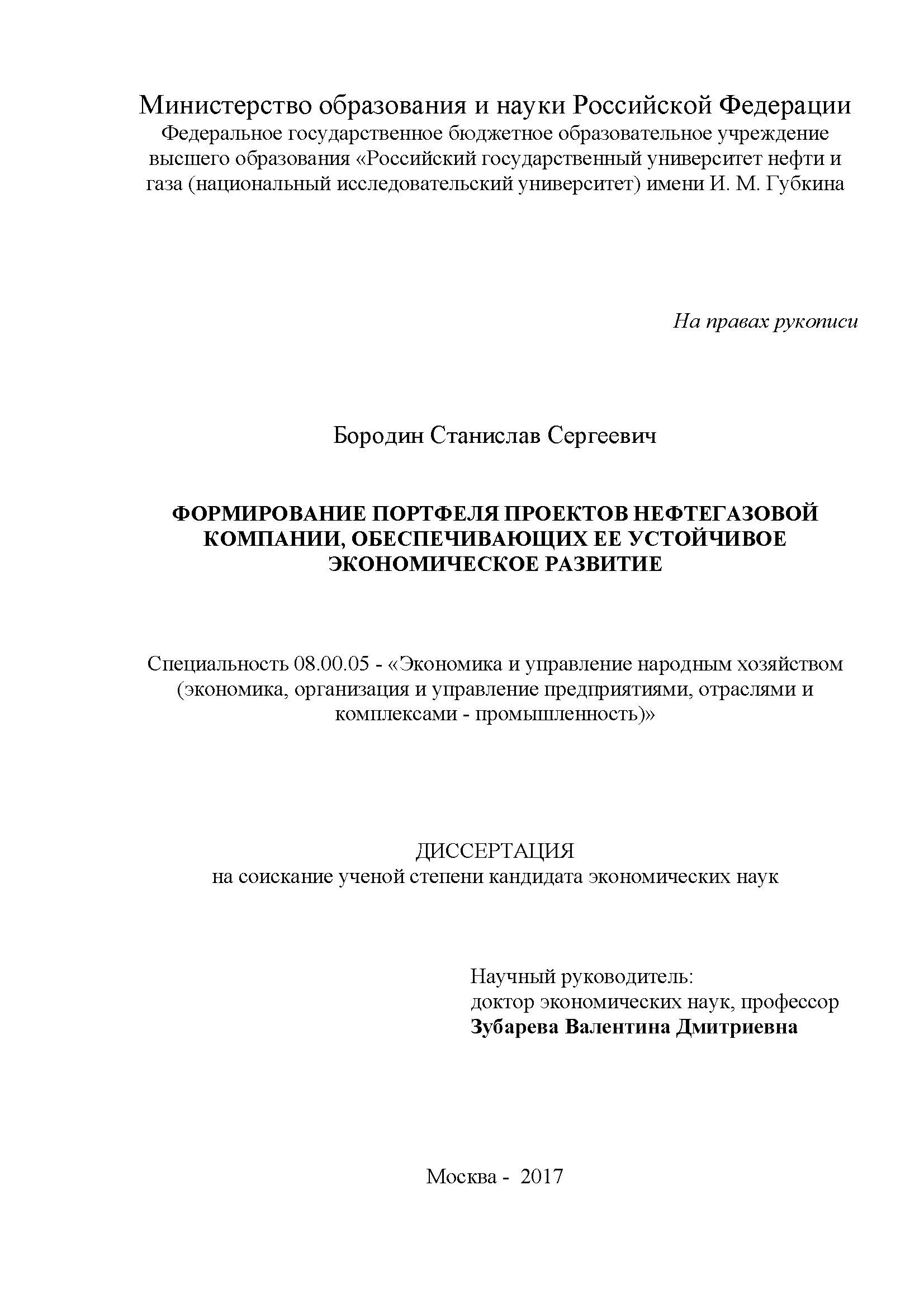 Формирование портфеля проектов нефтегазовой компании, обеспечивающих ее устойчивое экономическое развитие