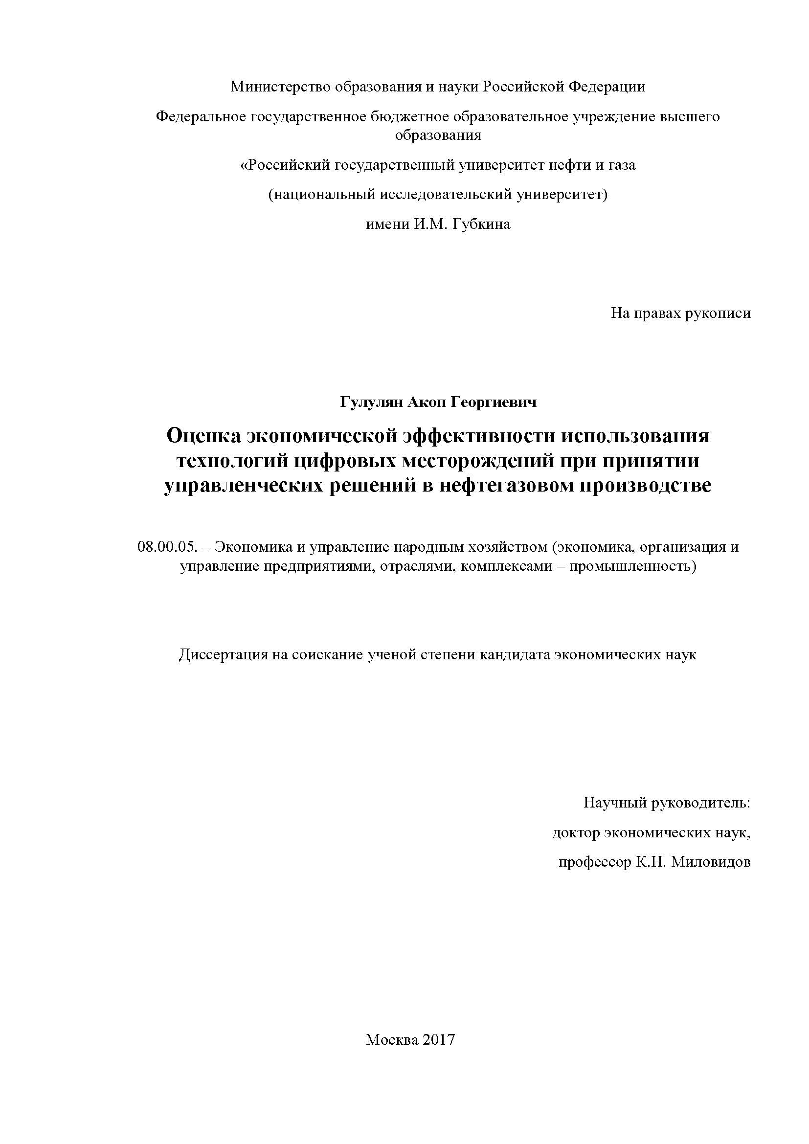 Оценка экономической эффективности использования технологий цифровых месторождений при принятии управленческих решений в нефтегазовом производстве