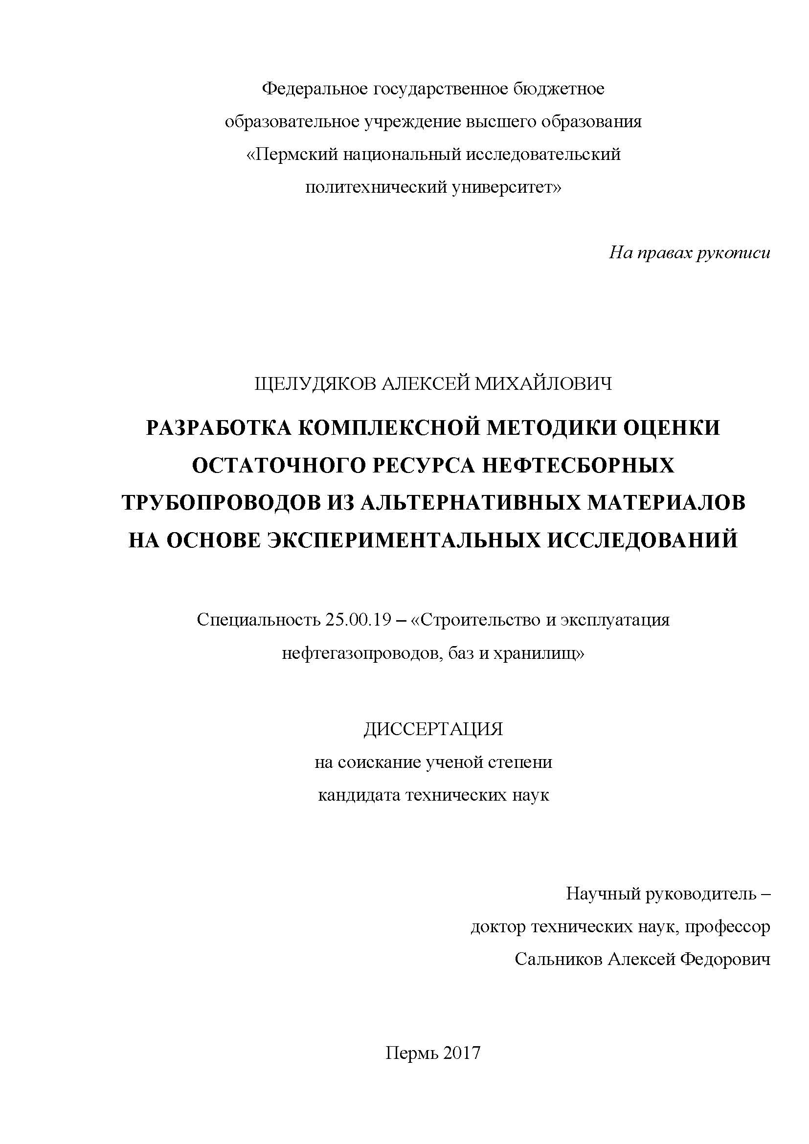 Разработка комплексной методики оценки остаточного ресурса нефтесборных трубопроводов из альтернативных материалов на основе эксперементальных исследований