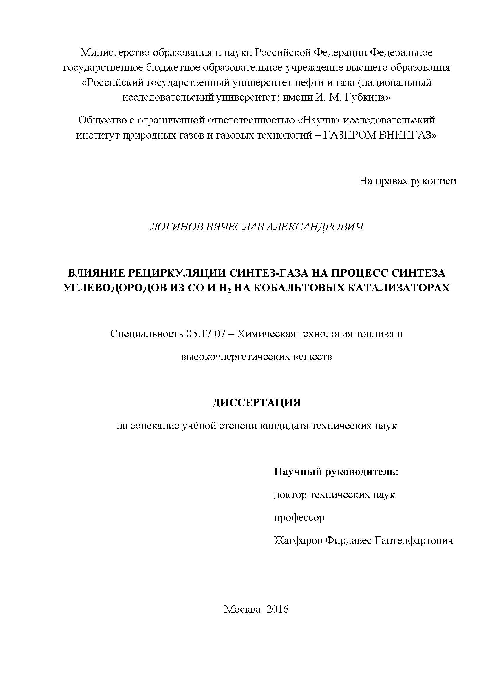 Влияние рециркуляции синтез-газа на процесс синтеза углеводородов из СО и Н2 на кобальтовых катализаторах