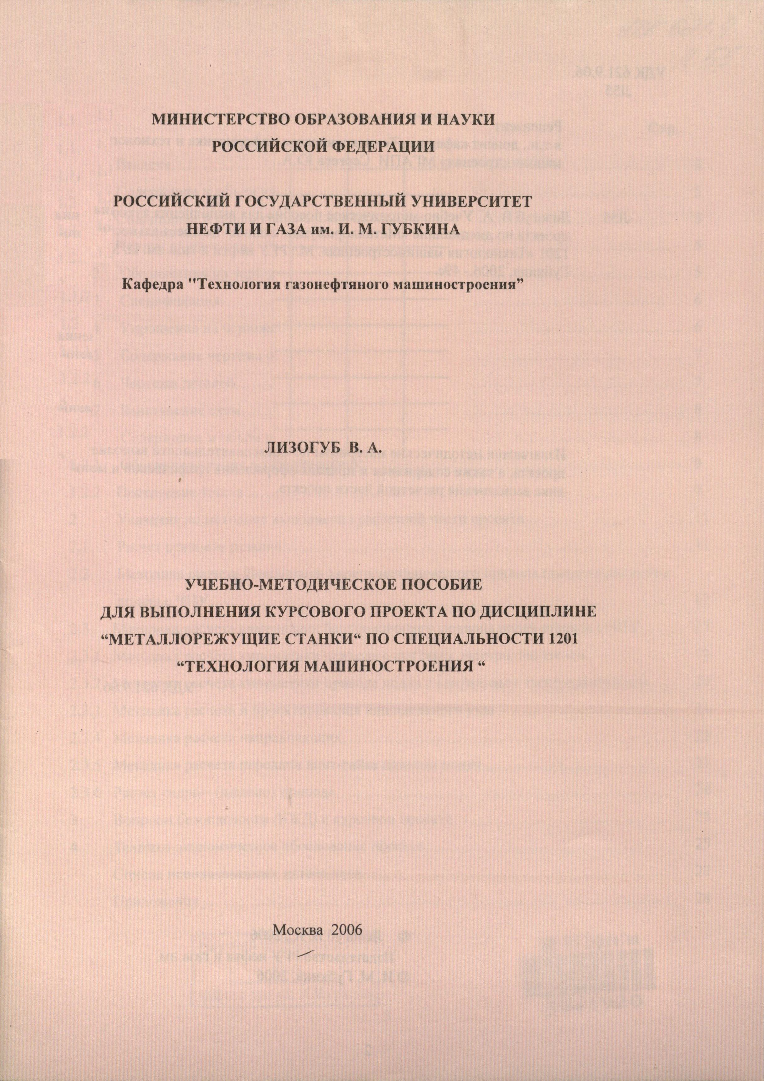 Учебно-методическое пособие для выполнения курсового проекта по дисциплине "Металлорежущие станки" по специальности 1201 "Технология машиностроения"