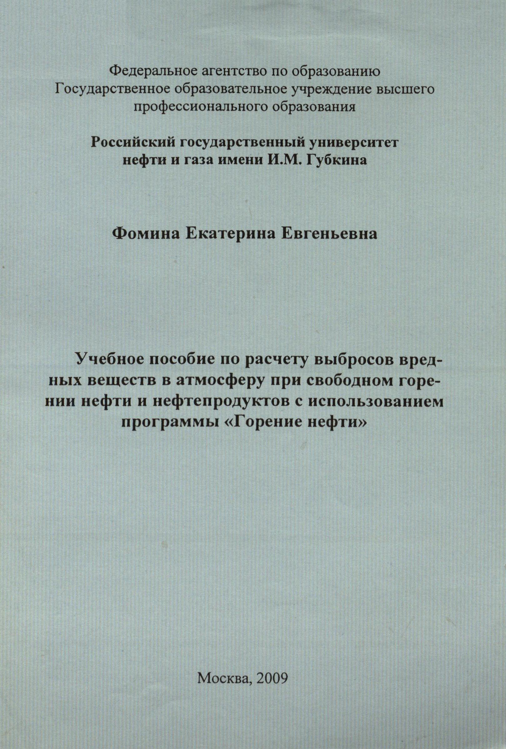 Учебное пособие по расчету выбросов вредных веществ в атмосферу при свободном горении нефти и нефтепродуктов с использованием программы "Горение нефти"