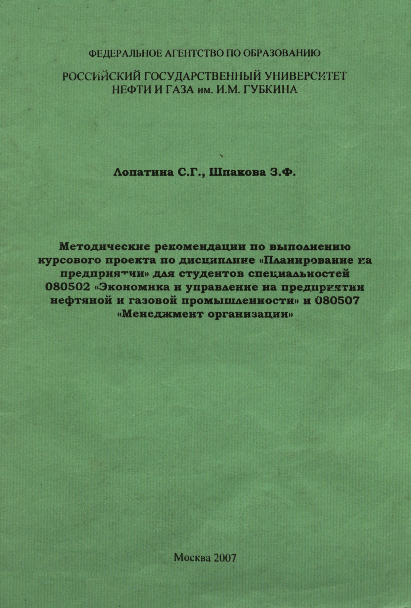 "Методические рекомендации по выполнению курсового проекта по дисциплине "Планирование на предприятии" для студентов специальностей 080502 "Экономика и управление на предприятии нефтяной и газовой промышленности" и 080507 "Менеджмент организации"" (PDF - 0.18 Мб)
