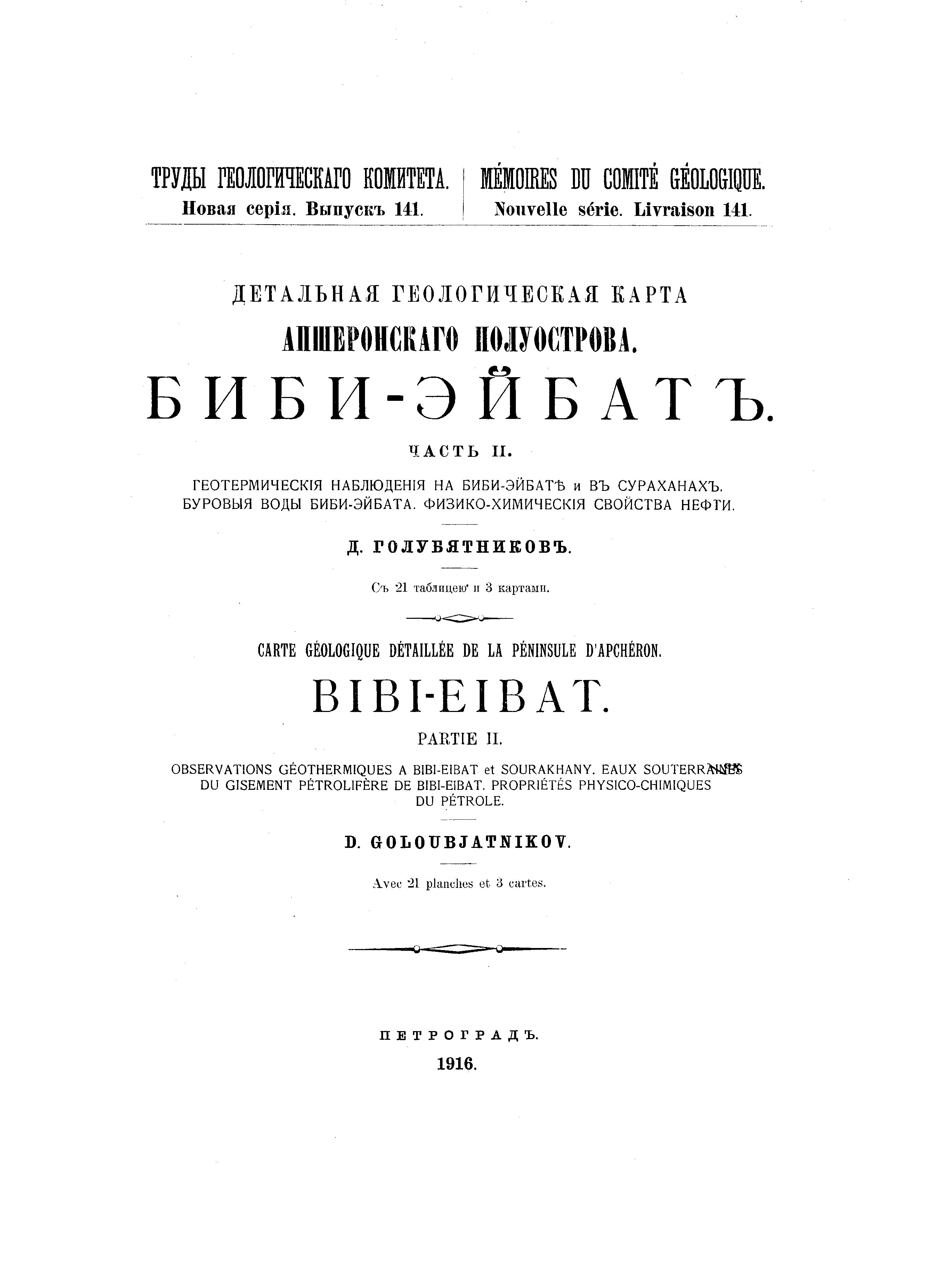 Детальная геологическая карта Апшеронского полуострова. Биби-Эйбат. Ч. 2. Геотермические наблюдения на Биби-Эйбате и в Сураханах. Буровые воды Биби-Эйбата. Физико-химические свойства нефти
