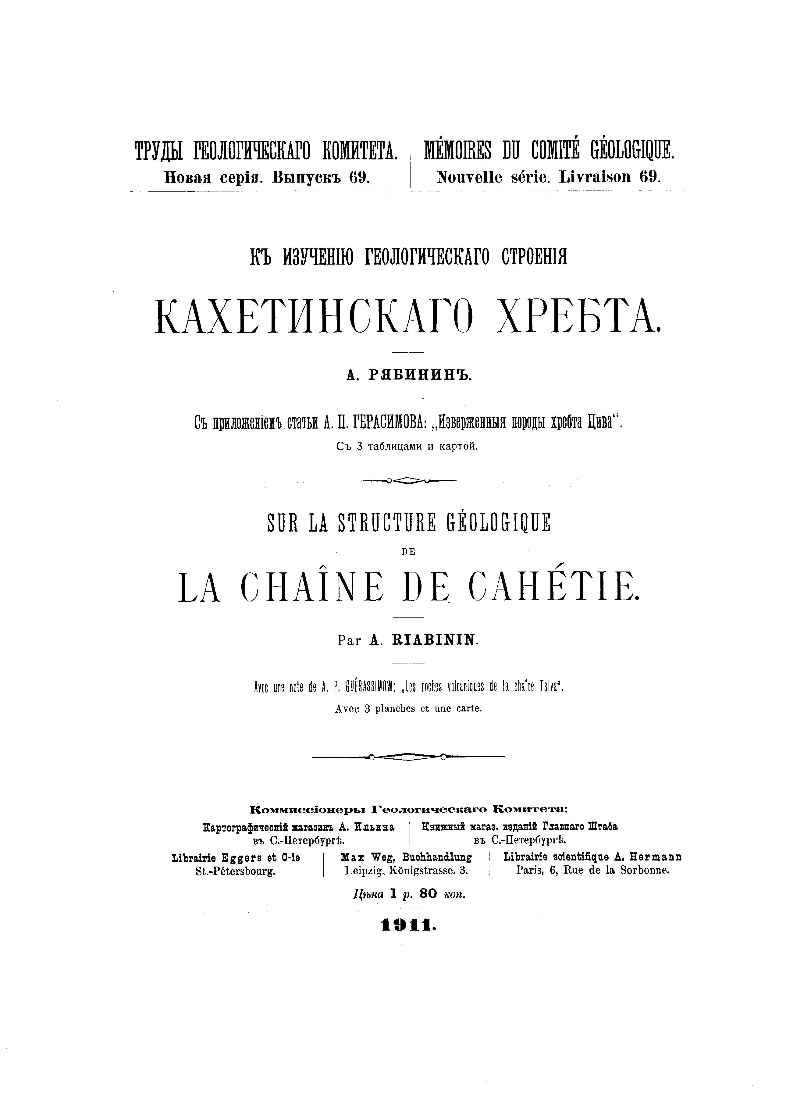 "К изучению геологического строения Кахетинского хребта с приложением статьи А.П. Герасимова "Извержение породы хребта Цива" с 3 таблицами и картой" (PDF - 6.11 Мб)