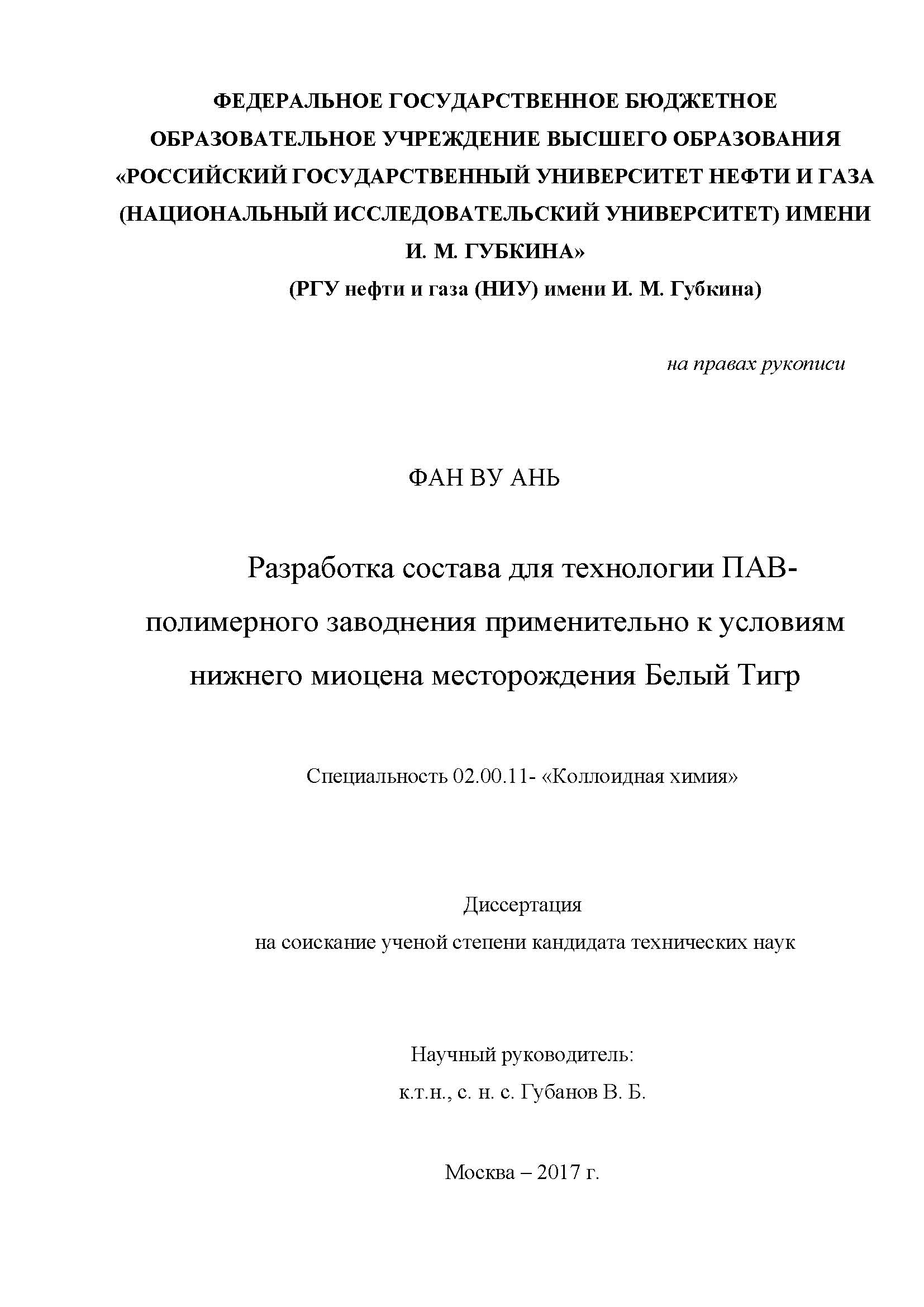 Цель диссертационной работы - разработка состава для технологии ПАВ-полимерного заводнения, применительно к условиям южного участка нижнего миоцена месторождения Белый Тигр (Социалистическая Республика Вьетнам).