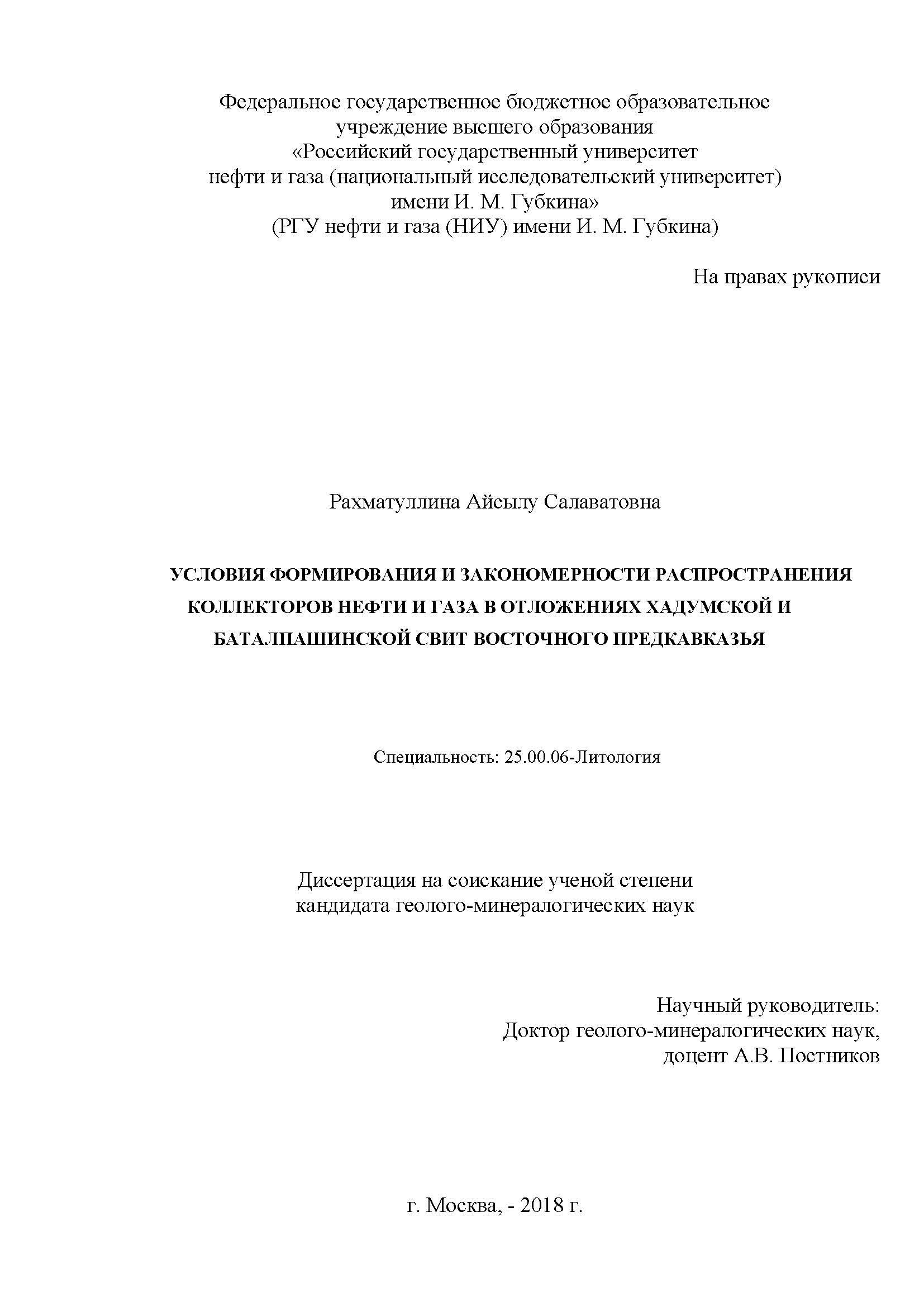 Условия формирования и закономерности распространения коллекторов нефти и газа в отложениях Хадумской и Баталпашинской свит Восточного Предкавказья