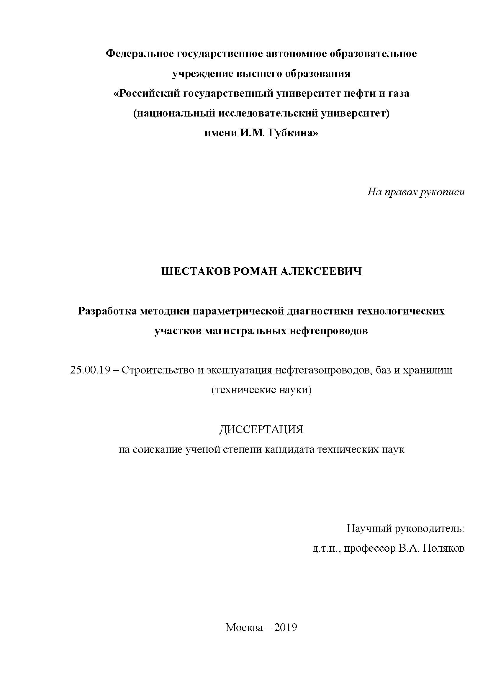 Разработка методики параметрической диагностики технологических участков магистральных нефтепроводов