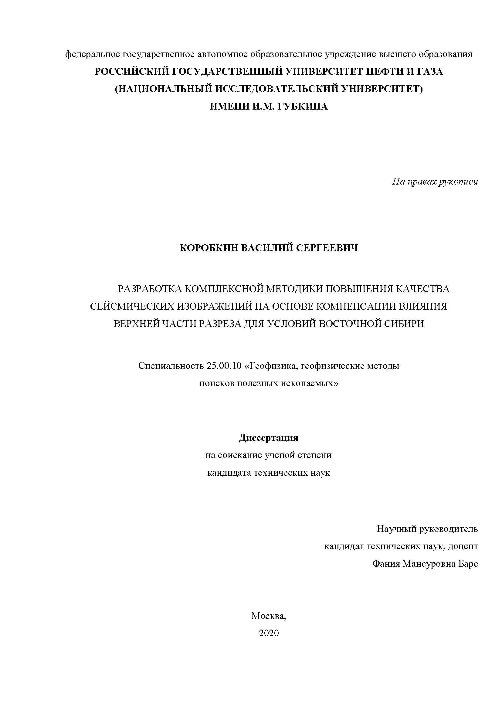 Разработка комплексной методики повышения качества сейсмических изображений на основе компенсации влияния верхней части разреза для условий Восточной Сибири