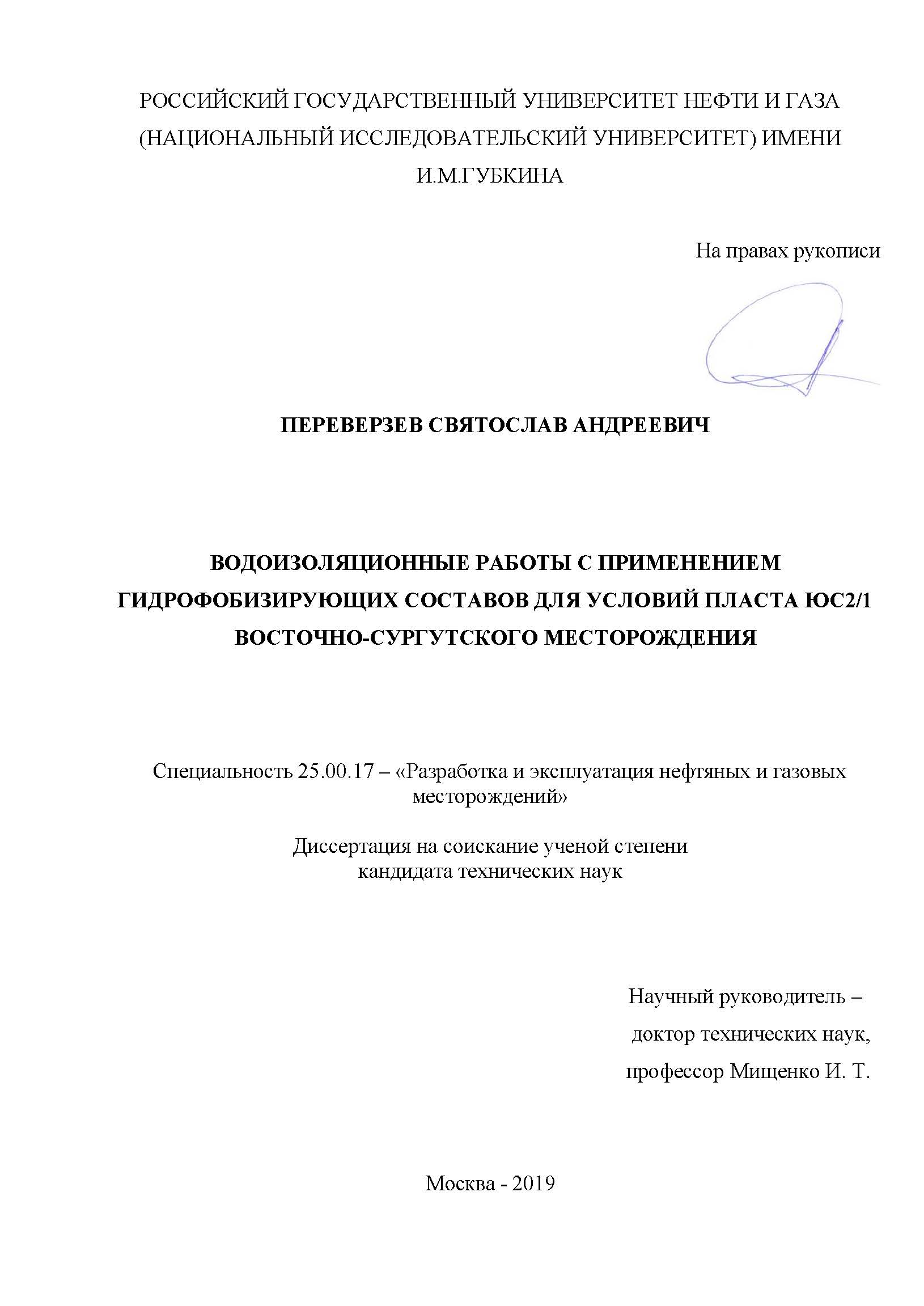 Водоизоляционные работы с применением гидрофобизирующих составов для условий пласта ЮС2/1 Восточно-Сургутского месторождения