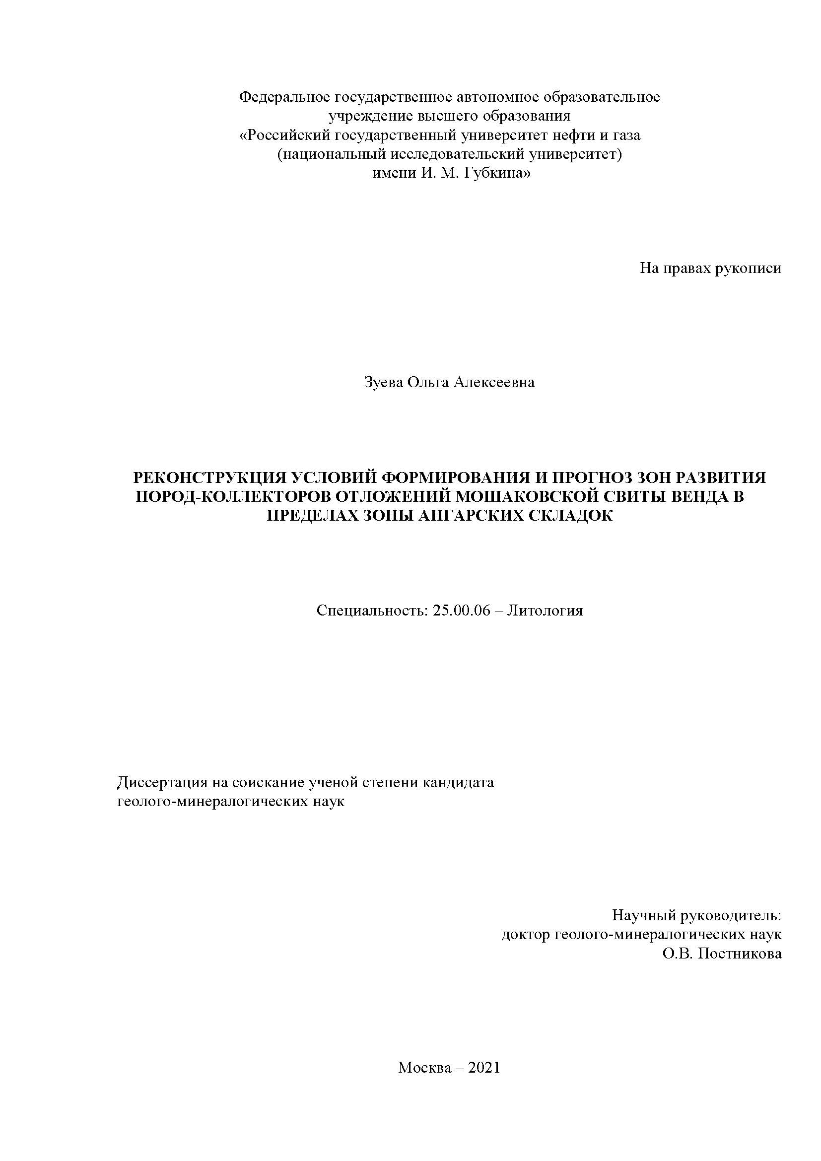 Реконструкция условий формирования и прогноз зон развития пород-коллекторов отложений мошаковской свиты венда в пределах зоны Ангарских складок