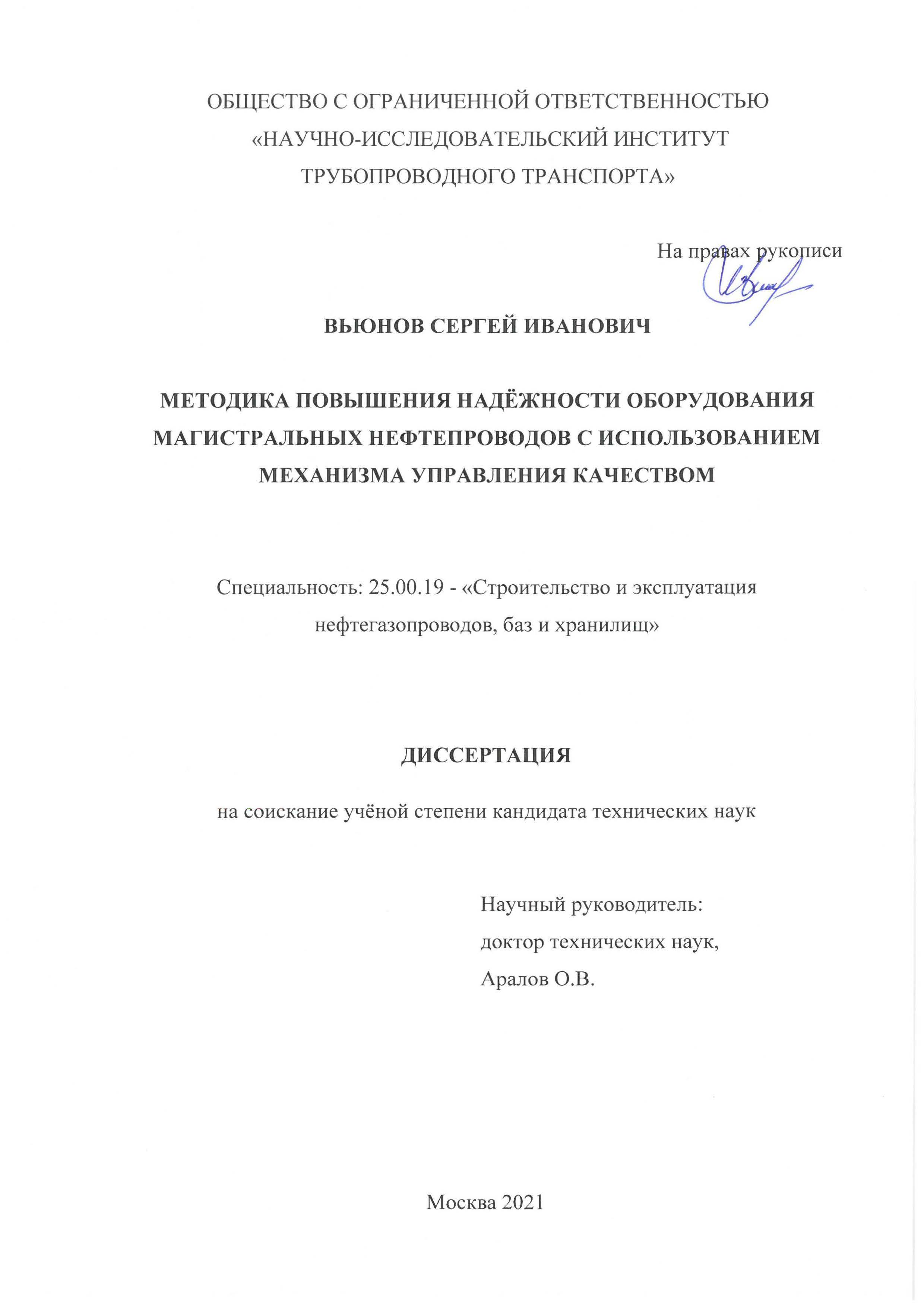 Методика повышения надёжности оборудования магистральных нефтепроводов с использованием механизма управления качеством