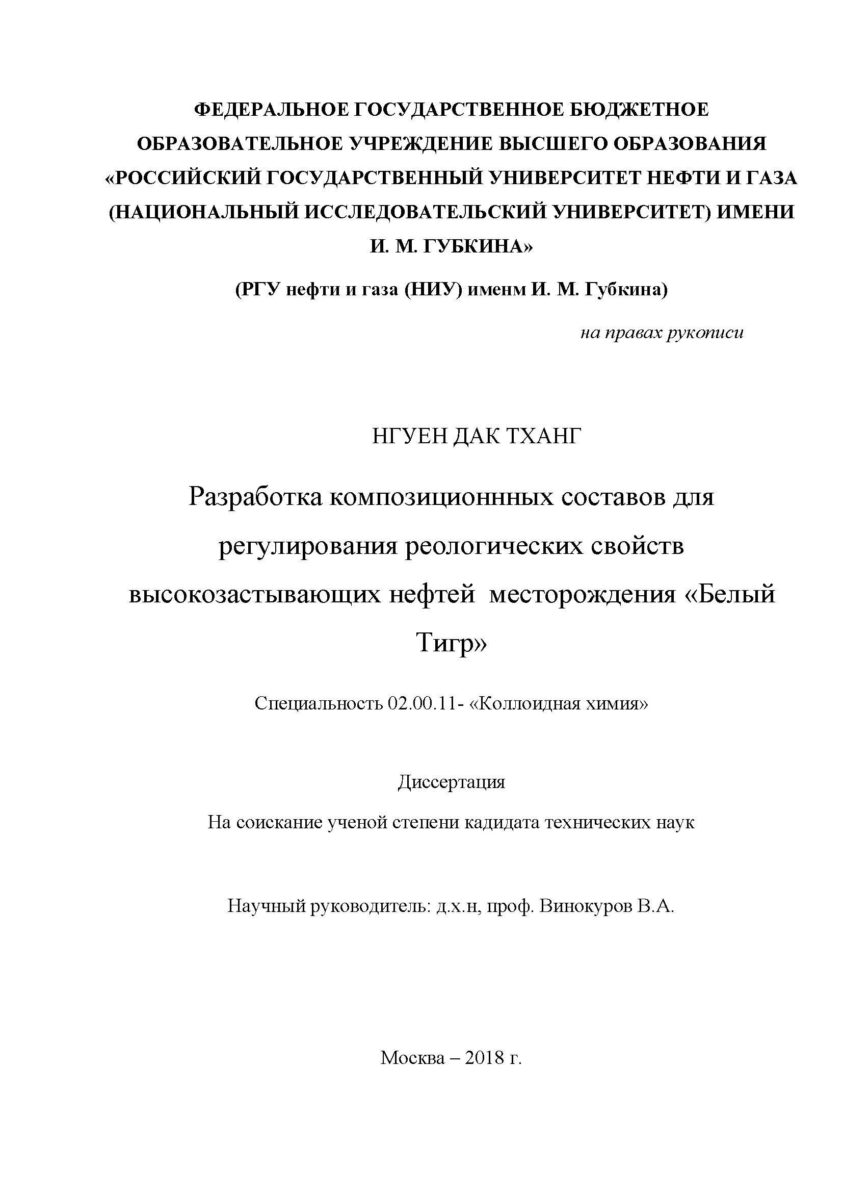 Разработка композиционных составов для регулирования реологических свойств высокозастывающих нефтей месторождения Белый Тигр