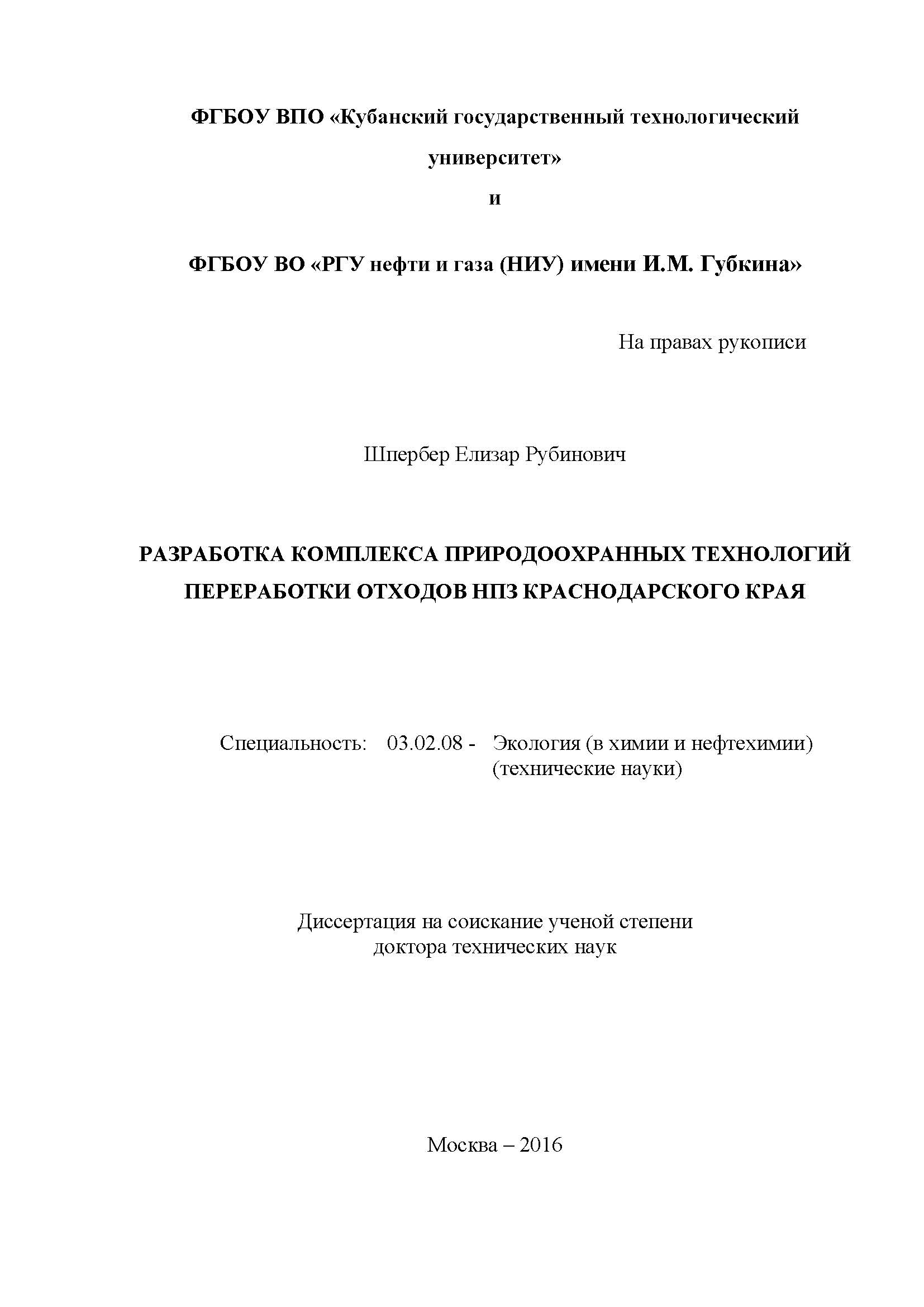 Разработка комплекса природоохранных технологий переработки отходов НПЗ Краснодарского края