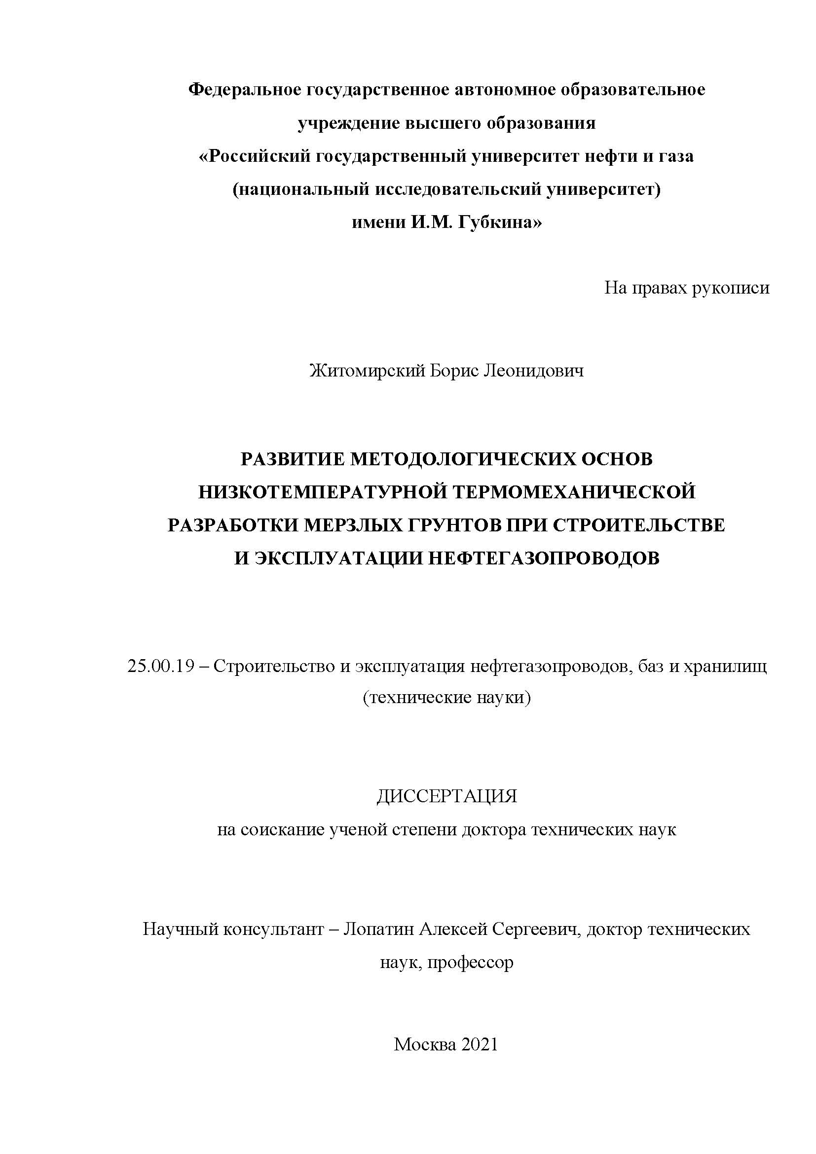 Развитие методологических основ низкотемпературной термомеханической разработки мерзлых грунтов при строительстве и эксплуатации нефтегазопроводов