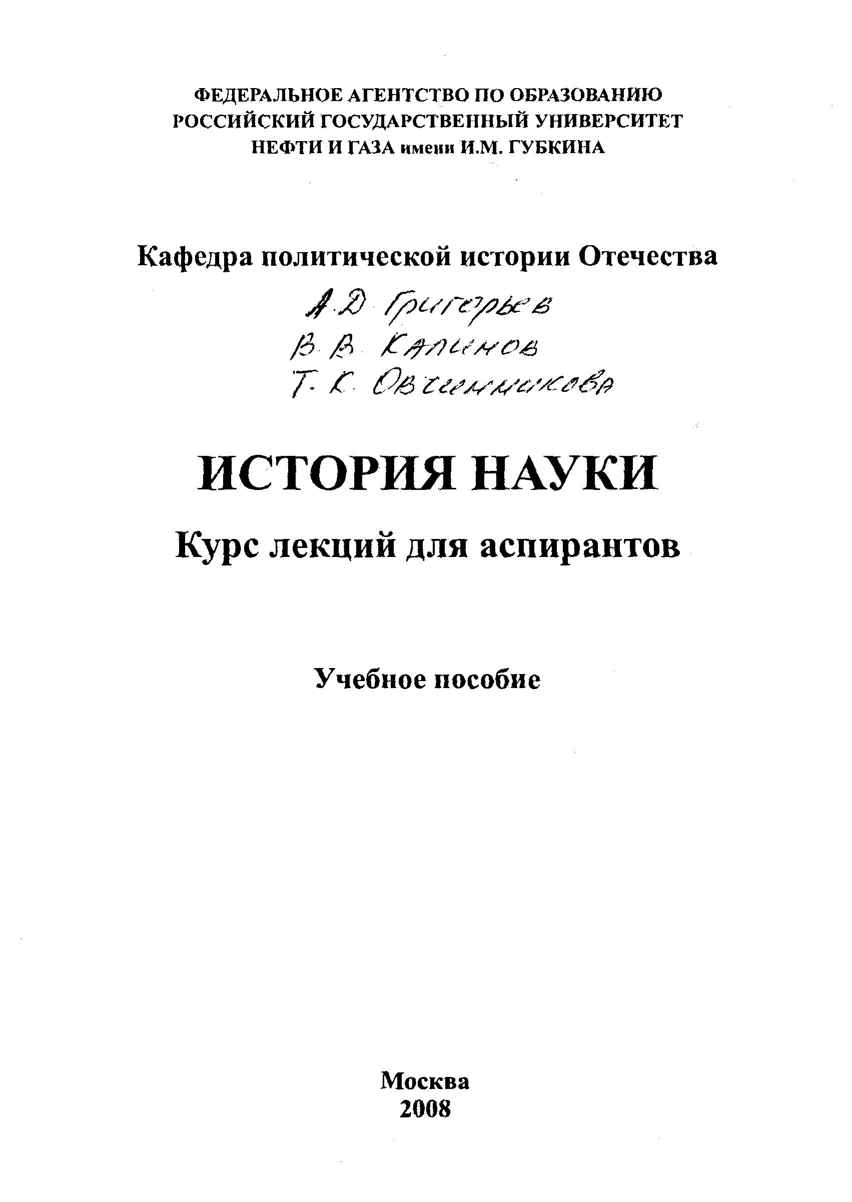 Учебное пособие представляет собой курс лекций по истории науки, читаемый аспирантам всех специальностей технического вуза нефтегазового профиля в рамках подготовки к сдаче кандидатского экзамена по истории и философии науки.