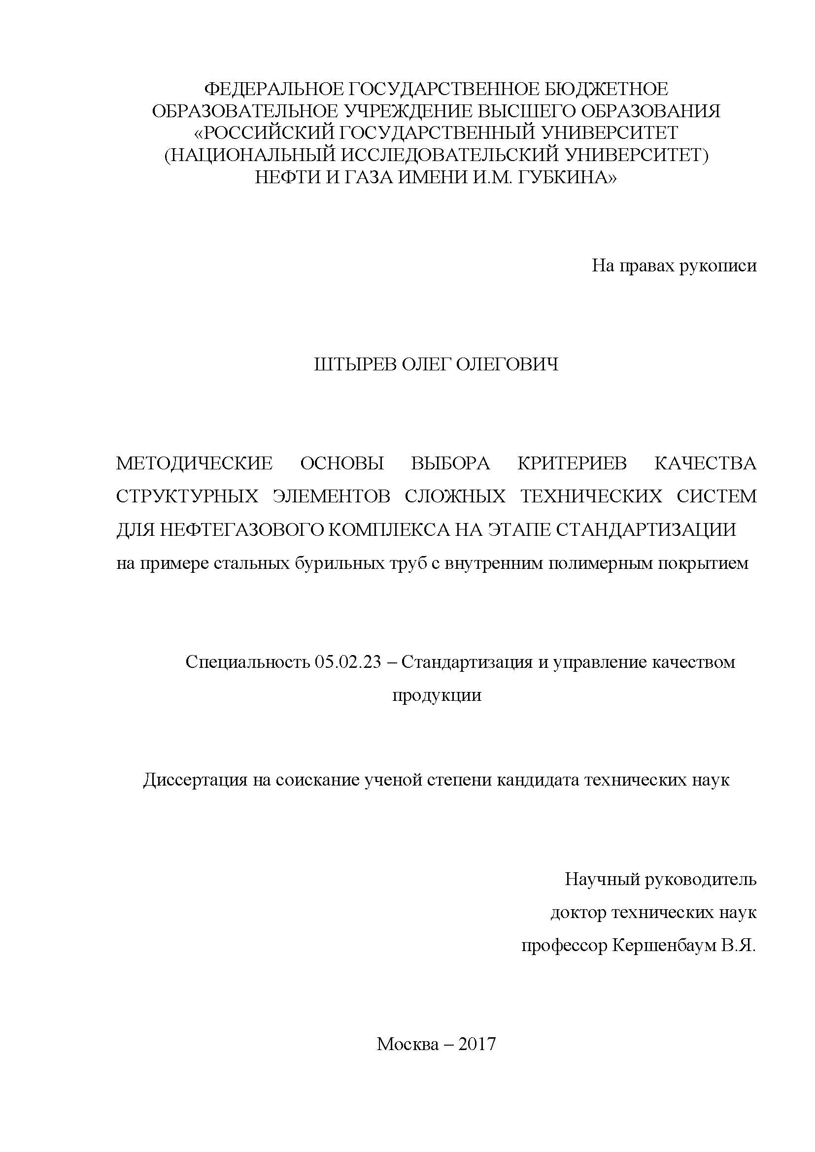 Методические основы выбора критериев качества структурных элементов сложных технических систем для нефтегазового комплекса на этапе стандартизации на примере стальных бурильных труб с внутренним полимерным покрытием