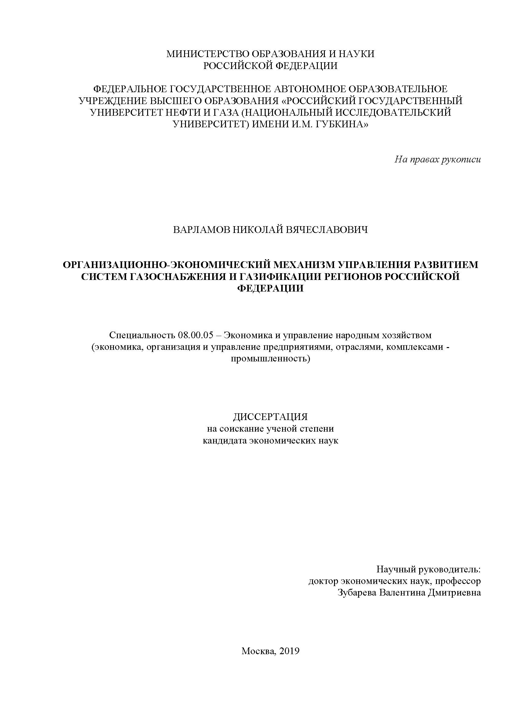 Организационно-экономический механизм управления развитием систем газоснабжения и газификации регионов Российской Федирации